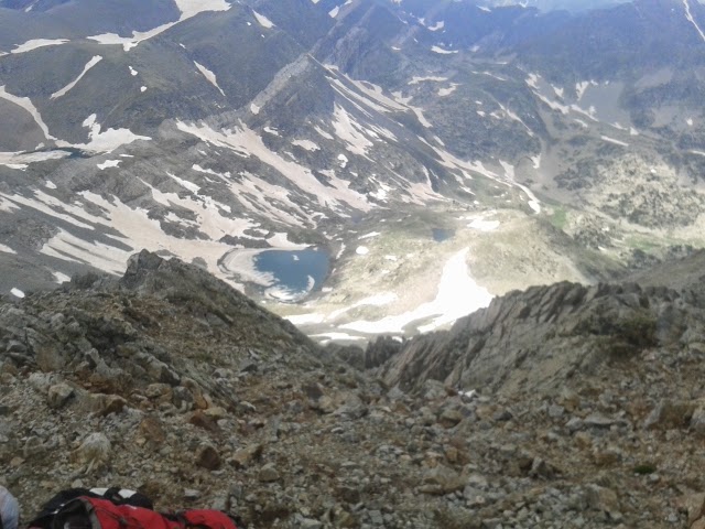 The first of the summits of the ridge we will be following is the Bastiments (2881m). It is the second highest of the whole course. Mainly the whole range is a pile of stones at some parts filled up in between so there is some sort of path. The going is very irregular, you have to take good care of each step and also very steep and once up we can see most of the range we will go along up and down for next few hours.