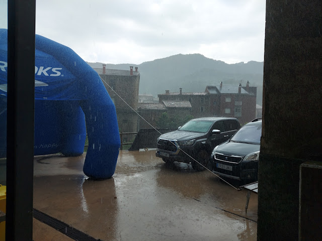 From here to the finish is only about 4km and mostly downhill. Just when I leave the aid station my watch, that can only handle detailed recording for 8 hours stops, so it is really a matter of head down and keep running from there on. We switch between rather steep and rocky trails to very wide and easy trails very often untill we start coming near to La Pobla de Lillet. The trails are very muddy and slippery here so it must have rained here before. On the other side of the valley a serious thunderstorm is developing and I hope to finish before it arrives. After some last winding throught the village I finished in 8h24m21s and headed straight for the Sports Centre. Soon afterwards it starts to rain very very hard so luckily I made it just before that.